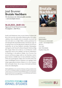 Buchpräsentation. José Brunner. "Brutale Nachbarn. Wie Emotionen den Nahostkonflikt antreiben - und - entschärfen können." Montag, 6. Oktober 2025, 18:00 Uhr. Sigmund Freud PrivatUniversität, Freudplatz 1, 1020 Wien